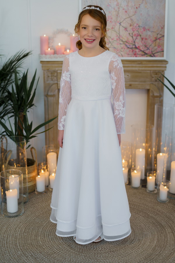 Schlicht gehalten mit langen Ärmeln aus Sitze. Der Rock ist mit Organza überzogen. Das Oberteil sehr schön bestickt.